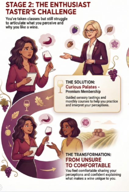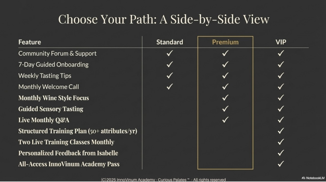 The Premium stage requires attending (or watching the replay) one guided tasting a month (60-90 minutes) and taking a short 15-20-minute class. The VIP stage is designed for those who can dedicate about an hour a week to follow the training plan and attend live sessions.